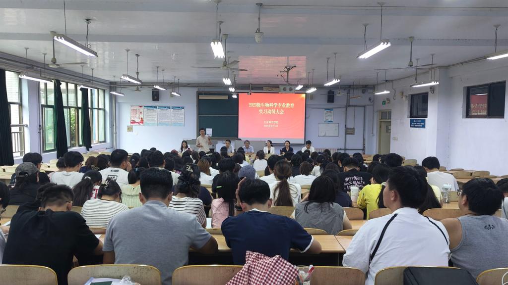 9月5日下午,伟德国际victor1946于求实楼0112教室召开2023级生物科学专业教育实习动员大会,旨在扎实推进支教实习工作,提升师范生教育实习成效。学院主要负责人、学生工作分管负责人、教学工作分管负责人、系主任、辅导员、班主任老师,以及2023级生物科学专业全体学生参加了会议。
